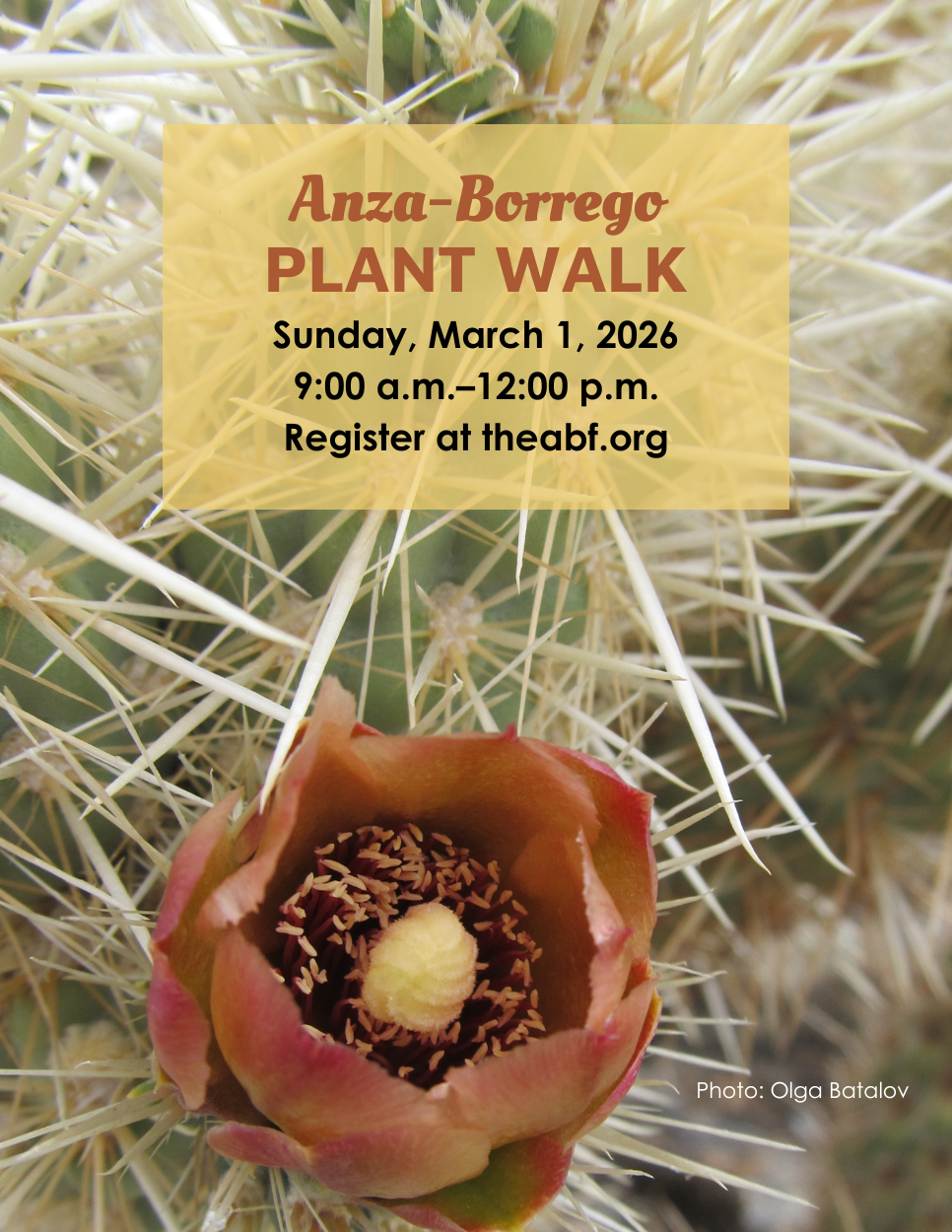 Join an expert botanist for a leisurely stroll through Anza-Borrego Desert State Park and uncover the hidden stories of desert plants—from brilliant wildflower blooms to the resilient species that thrive in harsh conditions. Learn how these fascinating plants adapt, survive, and shape one of California’s most unique ecosystems.