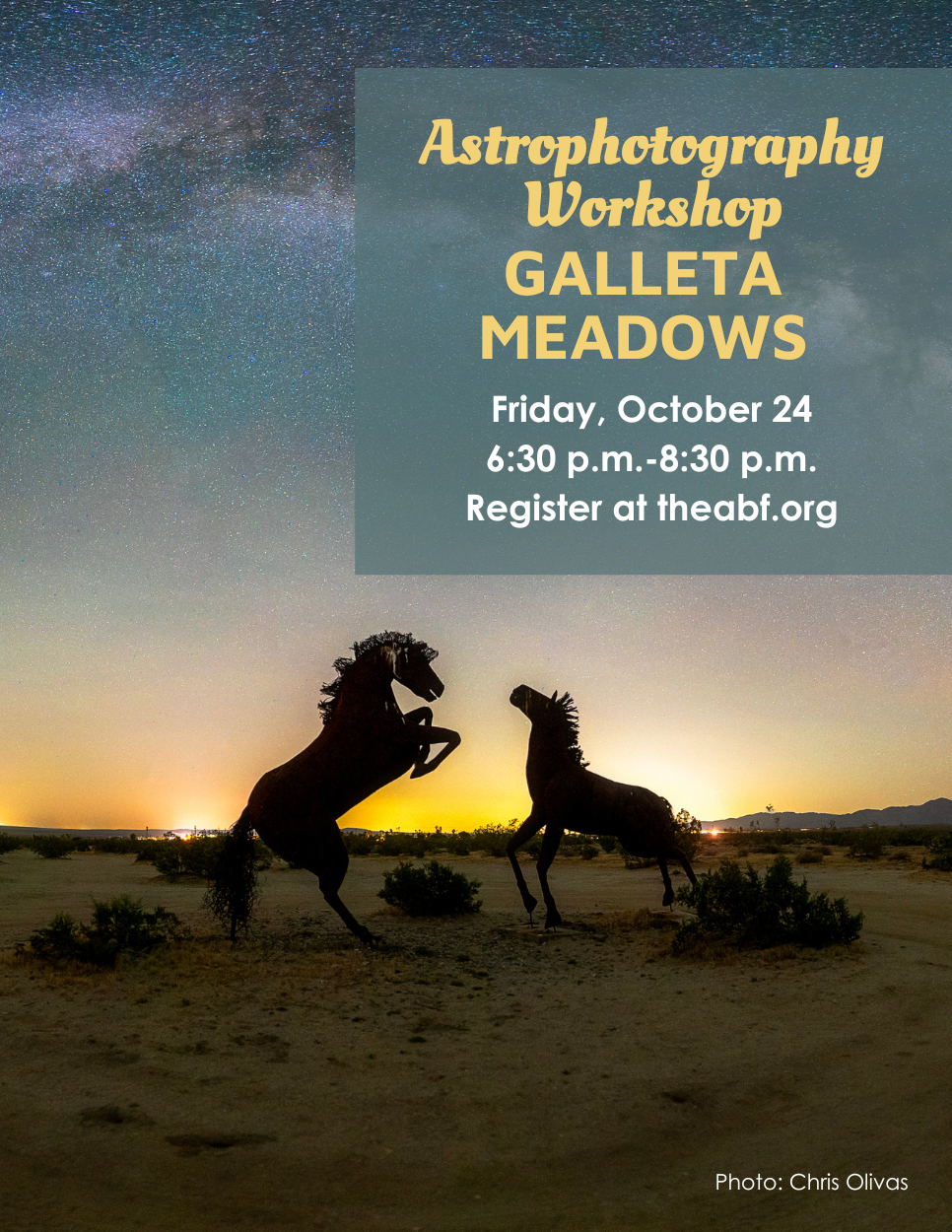 Location: Meet at the ABF office at 587 Palm Canyon Dr. #122 Borrego Springs, CA 92004 (in The Mall next to Kendall’s Café). We’ll then carpool/caravan to Galleta Meadows.