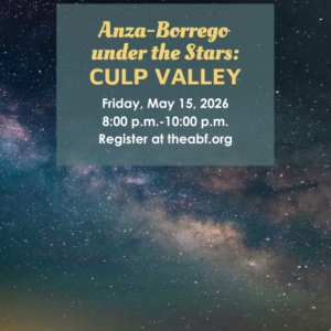 Location: Meet at the Anza-Borrego Foundation Administrative Office: 587 Palm Canyon Dr. #122, Borrego Springs, CA, 92004 (located in “The Mall” next to Kendall’s Café). We’ll then carpool/caravan to our field site in Anza-Borrego Desert State Park.