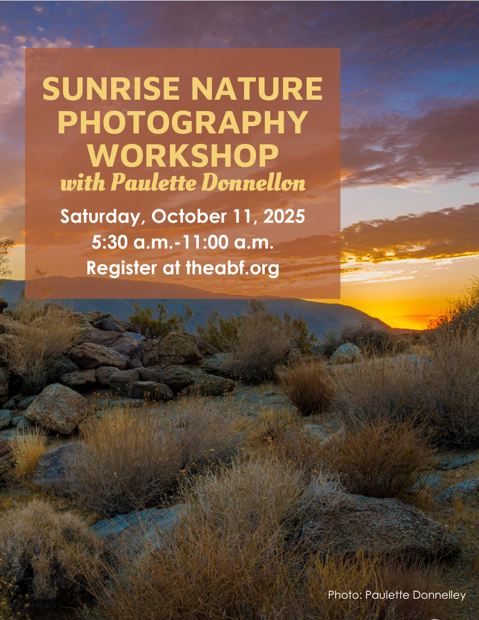 • Award-winning photographer Paulette Donnellon will share her expert tips for capturing the desert’s vibrant wildlife, intricate plant life, and breathtaking landscapes.
