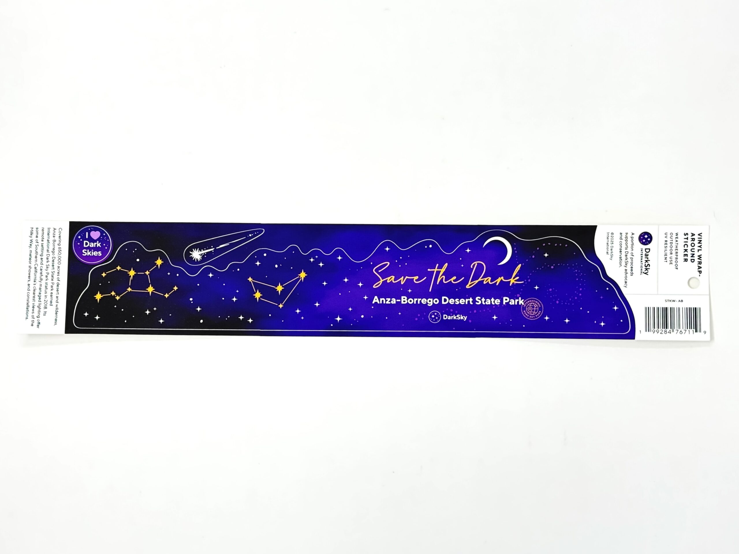 Celebrate the beauty of the night with the Save the Dark Vinyl Wrap Sticker, created in collaboration with DarkSky International and Anza-Borrego Desert State Park®, a certified International Dark Sky Park. This long-format, weatherproof decal features a sweeping desert horizon beneath a starlit sky filled with constellations, a crescent moon, and a bright comet — a tribute to the park’s pristine night skies.